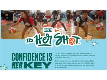 DICK’S Sporting Goods and Nike are back with It's Her Shot, a day of free basketball skills clinics and games for girls ages 8-18. Athletes will be grouped by age and skill level—all are welcome! It's Her Shot is a free event! Space is limited. The event is on Sunday, July 20, 2025, at Best Choice Fieldhouse in Fishers. https://itshershot.com/