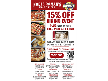 Use code CDC at Noble Roman's Craft Pizza in Carmel to get 15% off on Tuesday, October 21.